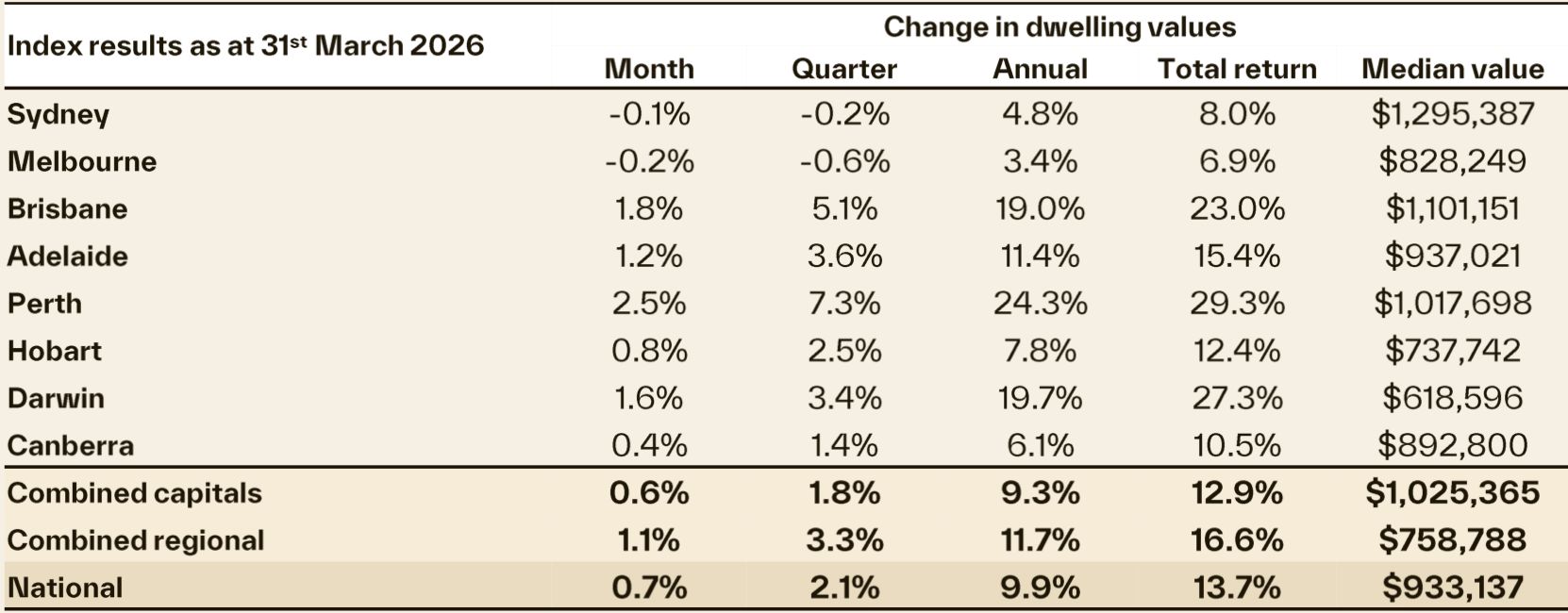 Cotality’s national home value index rose 0.7 per cent in March, which means dwelling values were 2.1 per cent higher over the first quarter of the year. But the pace of the gains is easing... down from a 2.8 per cent increase in the December quarter last year.