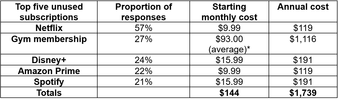However, it was unused gym memberships that were burning the biggest financial hole. Those surveyed who were not actively using their gym pass were spending around $93 per month on average, resulting in a cost of $1,116 per year.
