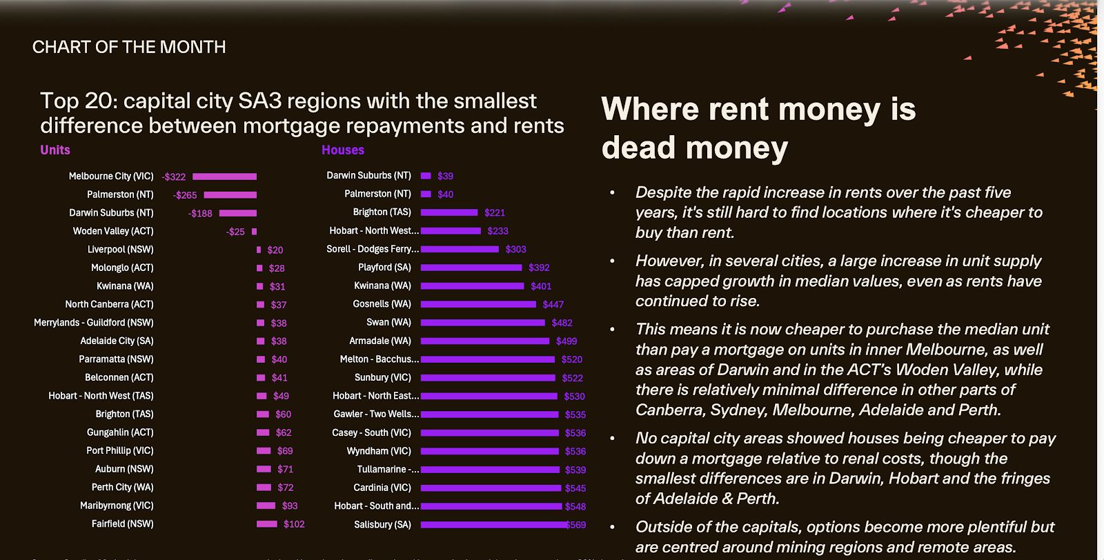 Inner Melbourne is one of the few markets where mortgage repayments on the median unit are estimated to be around $322 per month lower than the equivalent median rent.