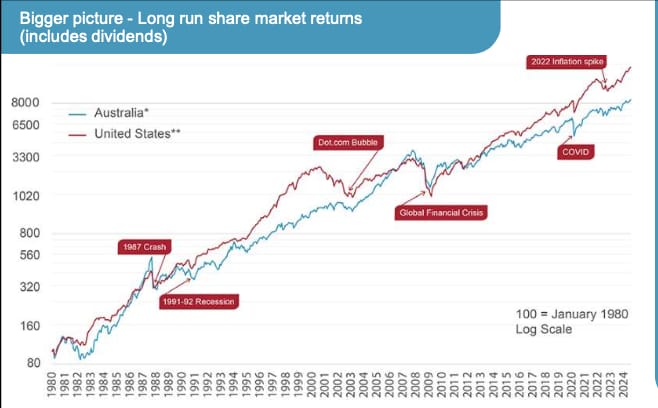 Despite setbacks like the market crash during Covid and Trump’s “Liberation Day” tariff impost, investors who have stuck to their strategy rather than panicking and moving to cash have fared far better over the long run.