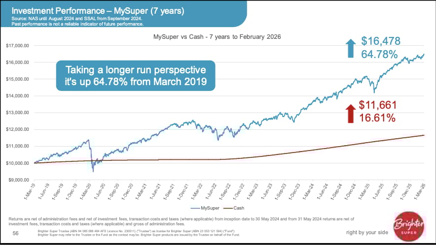 It shows the performance of Brighter’s MySuper default option since 2019 compared with investing in Brighter’s cash investment option. It is a stunning comparison.