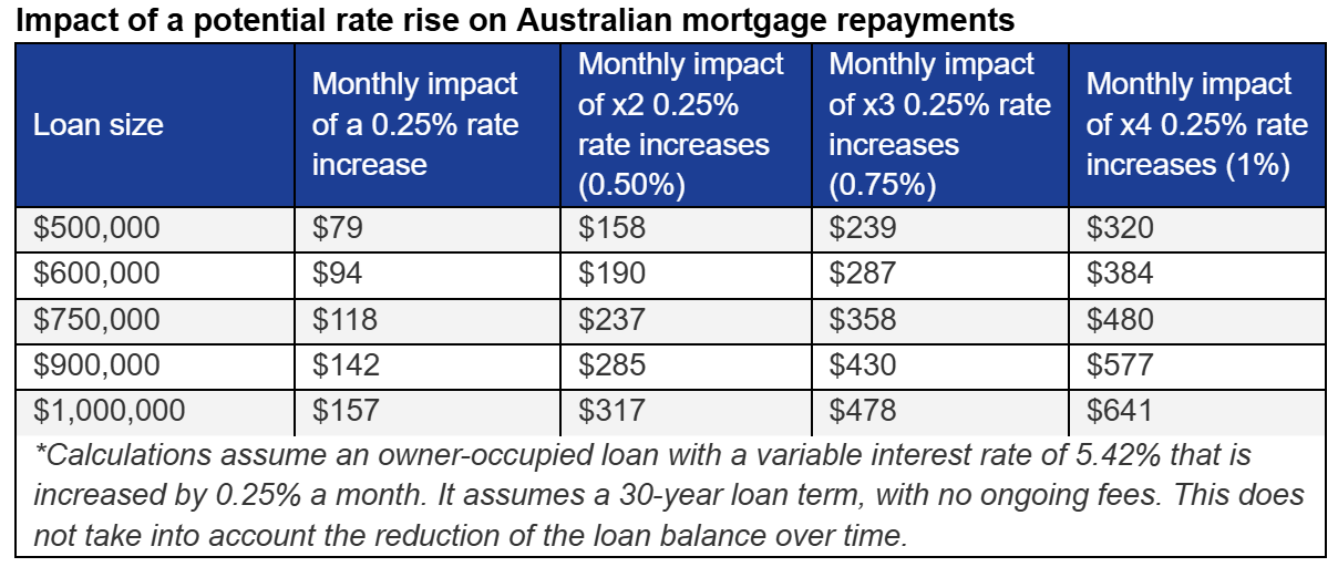 Add the two consecutive rate rises together and repayments on the average home loan ($694,000–$736,000) will be up around $200 a month … after a third hike, it would be almost $300 a month.